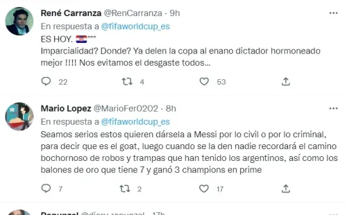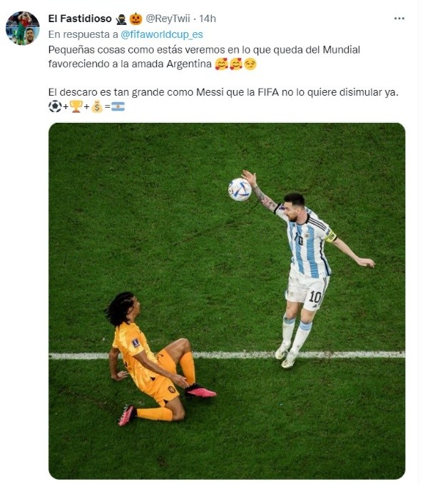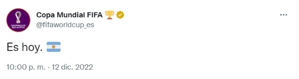 Entendiendo que la FIFA es el ente rector del fútbol mundial, la cuenta no debería tener preferidos, pero una publicación dejó en claro su favoritismo, quería que gane Argentina pues la apoyaba desde las redes sociales con un tuit.
