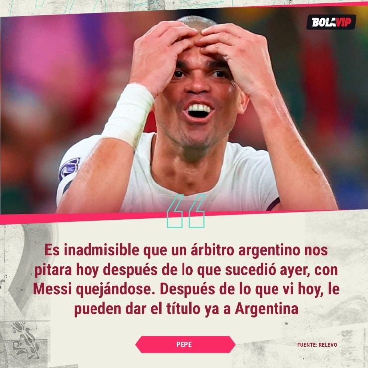 Pitazo final, y el ex Real Madrid, Pepe, sin autocrítica, se mandó con lo siguiente: “Es inadmisible que un árbitro argentino nos pitara hoy después de lo que sucedió ayer, con Messi quejándose. Después de lo que vi hoy, le pueden dar ya el título a Argentina”.