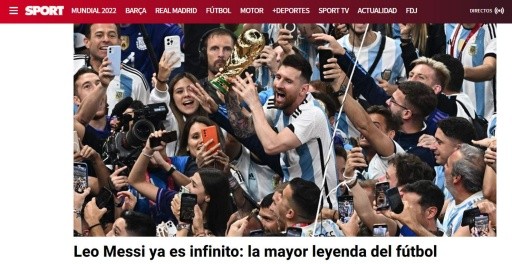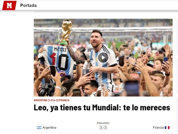 Llenando las portadas webs de los principales medios deportivos del mundo, la primera plana este domingo 18 de diciembre está dedicada a Lionel Messi y Argentina: campeones del Mundo en Qatar 2022. Alzándose luego de vencer a Francia en la tanda de penales por 4-2, tras empatar 3-3 en el cotejo, el plantel del técnico Lionel Scaloni empezó a escribir su propia historia.