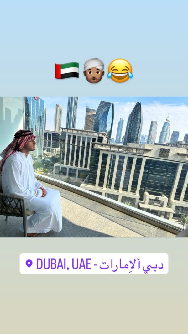 Compartiendo la imagen en sus stories de Instagram, el zaguero está en el balcón de un hotel. Con una impresionante vista, el defensor también colocó tres emojis: la bandera de Emiratos Árabes Unidos, el rostro de un hombre con barba y turbante y un emoji sonriente con lágrimas.