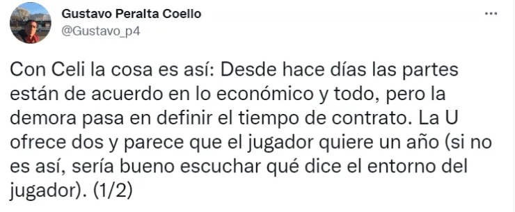 Y según el periodista, Gustavo Peralta, eso es lo único que está retrasando la llegada del jugador a Ate: “Con Celi la cosa es así: Desde hace días las partes están de acuerdo en lo económico y todo, pero la demora pasa en definir el tiempo de contrato. La U ofrece dos y parece que el jugador quiere un año (si no es así, sería bueno escuchar qué dice el entorno del jugador)… En el cuadro crema quieren definir ya el tema porque hay premura y consideran que sí o sí tiene que ser dos años de vínculo”, indicó.