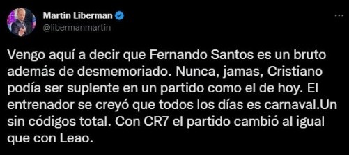 Alguien puede quererlo de forma genuina sin ser su familiar más que él. El Colorado Martín Liberman utilizó sus redes sociales personales para poder señalar al culpable de la eliminación de Portugal. El periodista deportivo, en su cuenta de Twitter, señaló al entrenador principal del cuadro luso.
