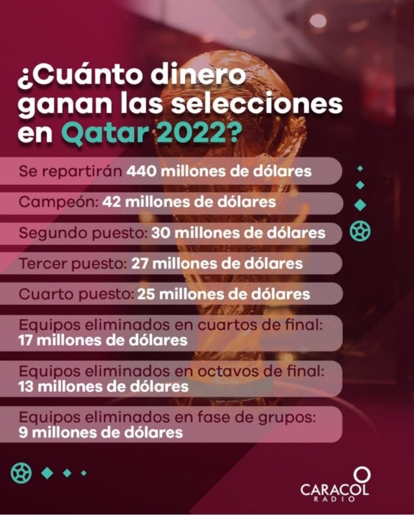 Esta información ha sido corroborada previamente, y es de público conocimiento, según informa la web oficial de FIFA. Donde podemos ir poco a poco con cada etapa obtenida. Las selecciones que se queden en la fase de grupo se llevan US$ 9 millones. De la misma manera, las que se queden en octavos de final, sumarán US $13 millones.