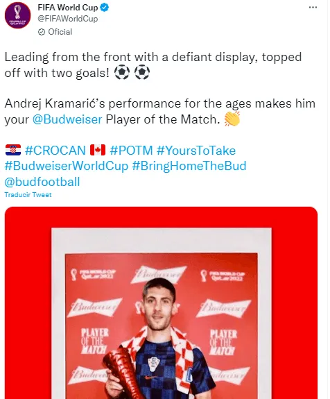 La Selección de Croacia dio vuelta al marcador y goleó, y uno de los autores fue Andrej Kramarić, quien anotó un doblete. El primero que hizo fue para el empate a los 35′ minutos del primer tiempo, tras un gran pase de Ivan Perisic. Luego pondría el 3-1 a los 70′ minutos, tras un remate contra el poste derecho del arco de Canadá.