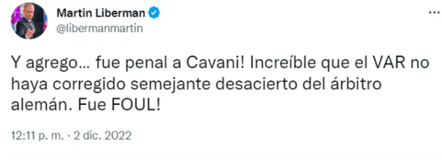 Luego, agregó: “fue penal a Cavani! Increíble que el VAR no haya corregido semejante desacierto del árbitro alemán. Fue FOUL!”