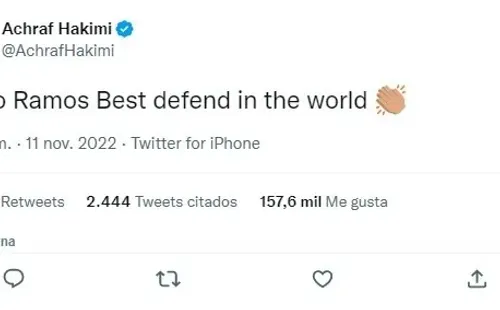 El defensa marroquí, a través de sus redes sociales, solo minutos después de que Luis Enrique anunciara la lista de 26 convocados para el Mundial Qatar 2022, lanzó un mensaje de apoyo para Ramos, al que calificó como el mejor del mundo en su posición.