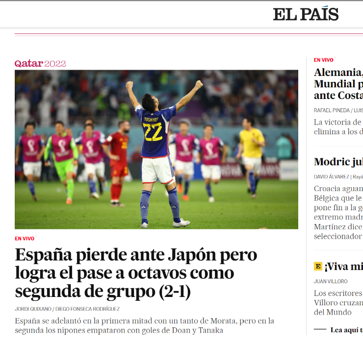 No obstante, esto dio un giro radical, ya que la escuadra asiática dio la sorpresa y venció en una épica remontada al conjunto español, que por un momento se quedaba fuera de la copa del mundo, debido a que Costa Rica también le volteó el partido a Alemania.