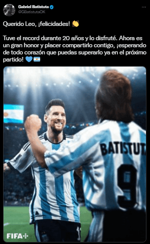 Cabe señalar que el propio Gabriel Batistuta en la previa a este duelo publicó un mensaje a favor del Enano: “Querido Leo, ¡felicidades! Tuve el récord durante 20 años y lo disfruté. Ahora es un gran honor y placer compartirlo contigo, ¡esperando de todo corazón que puedas superarlo ya en el próximo partido!”. Dicho y hecho, lo superó, convirtiéndose en el mejor de todos en este ítem.