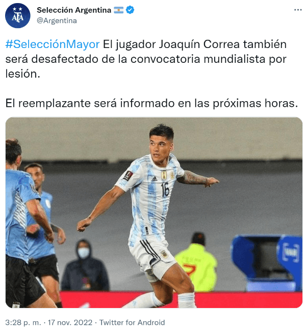 Es importante mencionar que Joaquín Correa había jugado el último amistoso de Argentina contra Emiratos Árabes Unidos e incluso anotó un gol, pero para el comando técnico no estaba al 100% y decidieron sacarlo de la nómina.