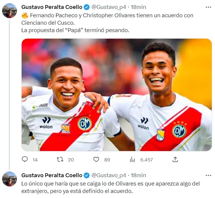 Así pues, si bien todavía no está la firma, todo está encaminado a que tanto Fernando Pacheco como Christopher Olivares llegarán a Cienciano.