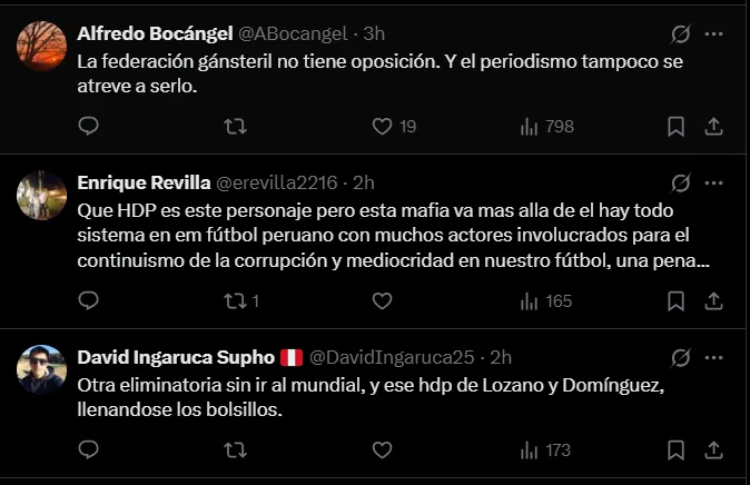 “Que Agustín Lozano siga al mando de la FPF solo confirma que el fútbol peruano seguirá agonizando hasta el 2030, cuando termine su mandato. Mientras tanto, seguirá haciendo sus grandes negocios y consolidando su propio equipo de poder”; comentó el periodista deportivo Franz Tamayo en una evidente señal de total desacuerdo y lamento por una decisión que está a punto a oficializarse.