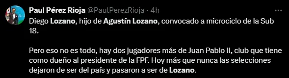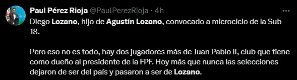 En las redes sociales de la ‘Bicolor’ se dio a conocer la lista de preselección Sub 18 para el primer microciclo de este equipo. Pero la gran sorpresa fue el llamado de Diego Lozano, hijo del actual presidente de la FPF. Pero no solo eso, sino que también se ha convocado a otros dos jugadores del Juan Pablo II. Club que también le pertenece a Lozano.