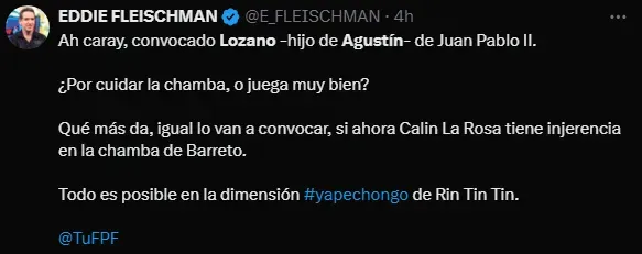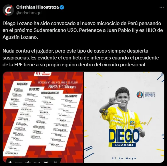 Otros usuarios como Cristhian Hinostroza explicó un poco mejor la situación. Pues hay un conflicto de intereses por parte del mandamás del fútbol peruano, que no solo tiene un club profesional, sino también a su hijo convocado. Algo que genera suspicacias con estas decisiones que se toman.