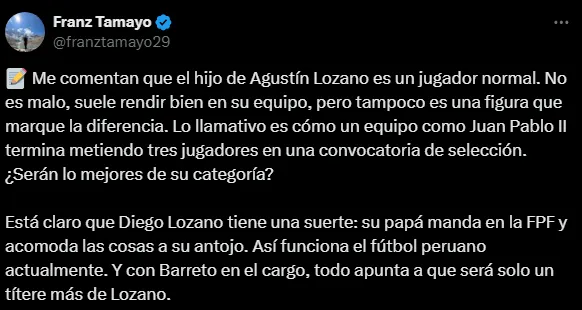Por su lado, el periodista Franz Tamayo investigó sobre como es el juego de Diego Lozano, confirmando que es un jugador con un nivel “normal”. Aparte de ello, sorprende el llamado de tres futbolistas convocados de un club como Juan Pablo II que recién está comenzando en el fútbol nacional.
