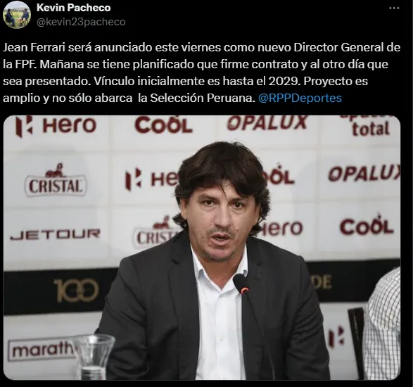 Según pudo dar a conocer el periodista Kevin Pacheco, Jean Ferrari este jueves 31 de julio firmará el acuerdo con la FPF. Casi de inmediato el día viernes 1 de agosto será presentado a la prensa. La idea con su llegada es tener un proyecto importante pensando no solo en abarcar a la Selección, sino ir un paso más como se pensaba con el ‘Ciego’, pero que al final no se hizo.