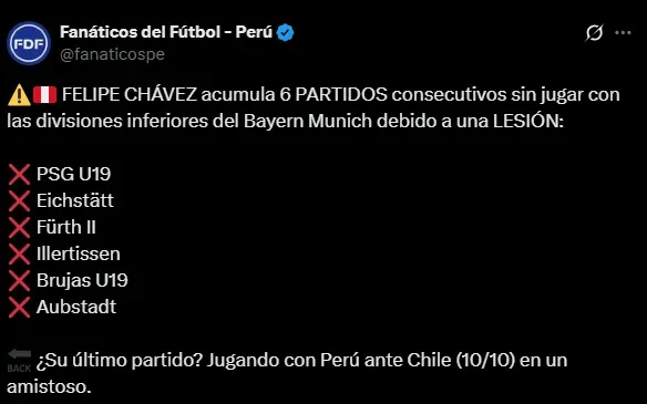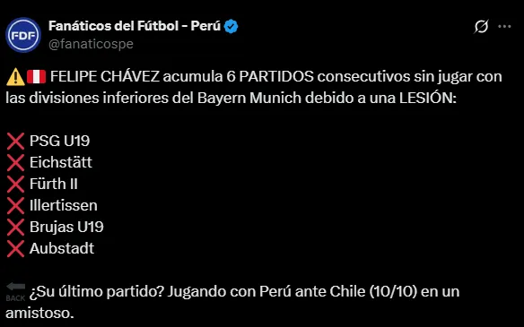 - Felipe Chávez, mediocampista del Bayern Múnich, sufrió una lesión tras la última convocatoria.