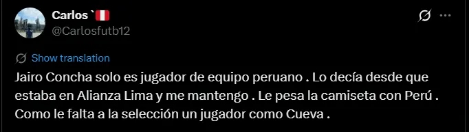 “Jairo Concha solo es jugador de equipo peruano. Lo decía desde que estaba en Alianza Lima y me mantengo. Le pesa la camiseta con Perú. Como le falta a la selección un jugador como Cueva” y “El peor de ’10’ de la historia de la selección”; fueron algunas de las reacciones más llamativas de los aficionados tras ver al volante en el más reciente Rusia vs. Perú que terminó empatado 1-1.