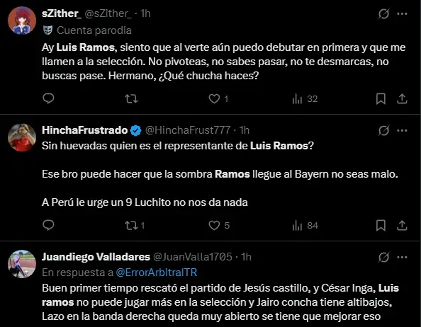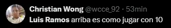 Luis Ramos tiene un objetivo que es ser el goleador de Perú, su posición así lo demanda al ser el 9 del equipo. Pero no está siendo efectivo a la hora de jugar y asociarse, lo cual no le permite ser alguien que aporte al equipo. Esto ha hecho que el hincha se sienta bastante molesto con respecto a su ingreso en el partido.
