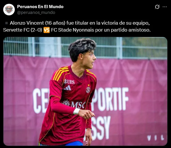En este caso tenemos a un peruano de solo 17 años que viene jugando en Suiza. A su corta edad ya ha podido jugar en el primer equipo de forma oficial, su nombre es Alonzo Vincent y juega como defensor central en el Servette FC. Al estar en parón por fecha FIFA su equipo jugó un encuentro amistoso este fin de semana, teniendo al peruano como titular en su equipo.