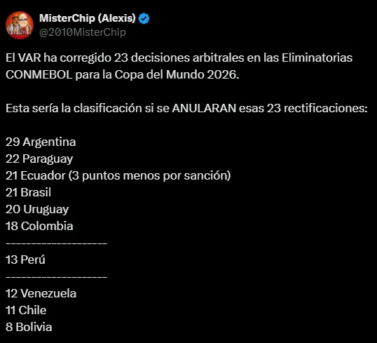En total fueron 23 decisiones que el VAR tomó a lo largo de las 13 fechas de las Eliminatorias Rumbo al Mundial 2026. De no haber un cambio por el Video Arbitraje la tabla hubiera tenido un cambio importante, sobre todo en la parte baja. Donde Perú sería el más beneficiado, seguido por Chile que también estaría muy bien posición y Bolivia el más perjudicado de todos.