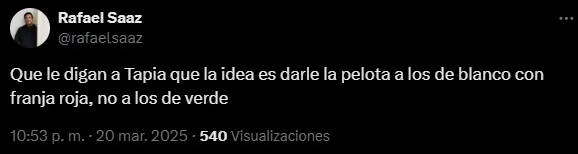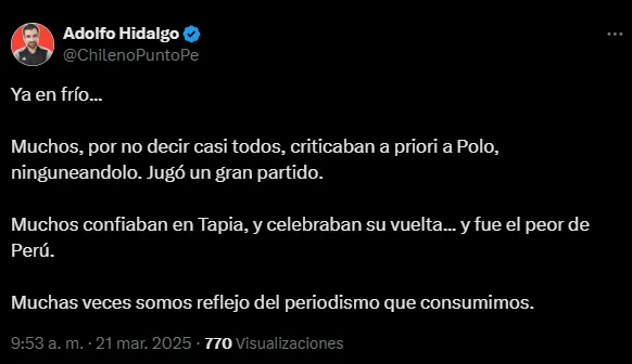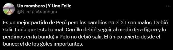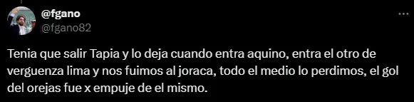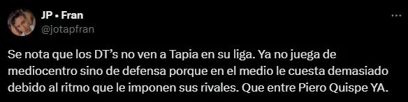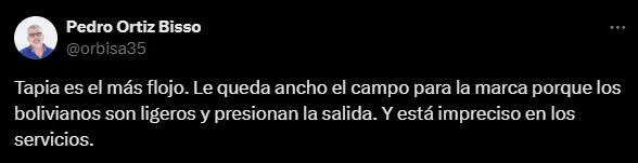 “Muchos confiaban en Tapia, y celebraban su vuelta… y fue el peor de Perú“, tiró un fanático en la red social X (Twitter). “Tapia es el más flojo. Le queda ancho el campo para la marca porque los bolivianos son ligeros y presionan la salida. Y está impreciso en los servicios”, comentó otro.
