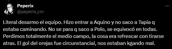 “Desconectado el mediocampo, Tapia sin ritmo“, apuntó otro hincha. “Se nota que los DTs no ven a Tapia en su liga. Ya no juega de mediocentro sino de defensa porque en el medio le cuesta demasiado debido al ritmo que le imponen sus rivales“, opinó otro usuario de X comparando su nivel con lo que muestra los fines de semana con Leganés.