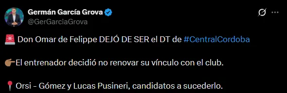 “Ricardo Gareca fue ofrecido para dirigir a Central Córdoba. Es uno de los tantos nombres que le hicieron llegar a la dirigencia, que ya busca al sucesor de De Felippe. Desde lo económico es difícil que se concrete. Sebastián Méndez, Orfilia y Pusineri también están en el radar”, fue lo que publicó en sus redes sociales.