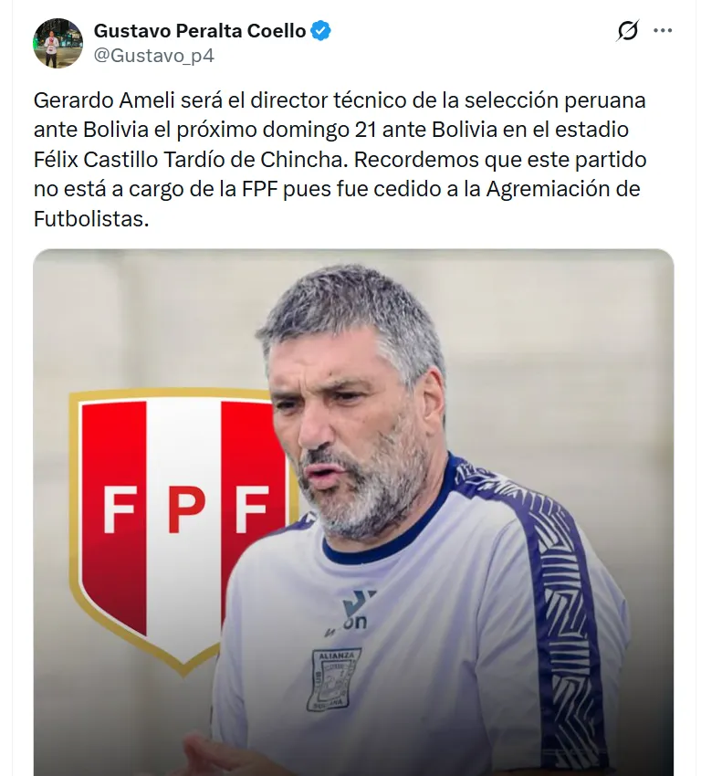 La Selección Peruana vivió una de las mayores sorpresas del año: la Agremiación de Futbolistas decidió designar a Gerardo Ameli como técnico de Perú para el amistoso ante Bolivia del próximo 21 de diciembre en Chincha, según reveló el periodista Gustavo Peralta.