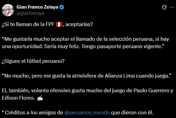 La aparición de esta joven promesa del Genoa de Italia tiene emocionado a varios hinchas que ya lo quieren ver con la camiseta nacional. Así que se hizo la pregunta respectiva sobre si está interesado en representar al Perú y la respuesta fue positiva. Lo cual ahora todo está en manos de Manuel Barreto, que como jefe de la Unidad Técnica de Menores tiene que hacer la gestión respectiva para no perder a un talento como este.