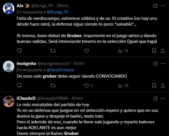 Por otro lado, la cuenta oficial de la Selección Peruana destacó el debut de Fabio Gruber. Felicitándolo por haber jugado su primer partido con los colores nacionales. Lastimosamente no pudo terminar celebrando una victoria, así que tendrá que esperar un poco para conseguir que esto se pueda llegar a dar pronto.