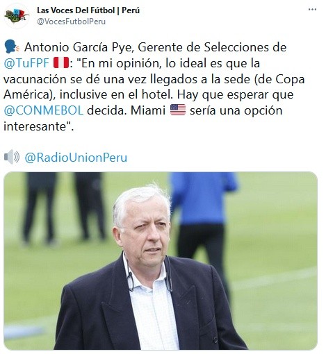 “En mi opinión, lo ideal es que la vacunación se dé una vez llegados a la sede (de Copa América), inclusive en el hotel. Hay que esperar que CONMEBOL decida. Miami sería una opción interesante”, complementó.
