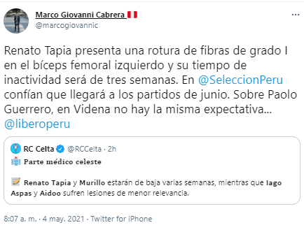 Esto último fue el parte médico notificado por parte del Celta de Vigo. La percepción emitida desde VIDENA (Ricardo Gareca) no es tan mala con respecto a esta lesión, saben de la fortaleza física de Renato Tapia, y confían en tenerlo lo más pronto posible. A comparación de Paolo Guerrero. Señala el periodista deportivo; Marco Giovanni (TV Perú – Diario Líbero).