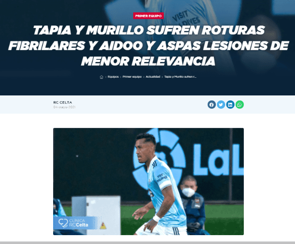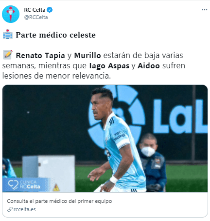 “Las pruebas realizadas por los servicios médicos del club revelan que el RC Celta perderá durante varias semanas a Renato Tapia y a Jeison Murillo, mientras que Iago Aspas y Aidoo sufren lesiones de menor relevancia. Las ecografías realizadas desvelan que Murillo sufre una rotura de grado I en el recto anterior del muslo izquierdo y estará de baja en torno a cuatro semanas. Por su parte, Renato Tapia presenta también una rotura de fibras de grado I en el bíceps femoral izquierdo y su tiempo de inactividad rondará las tres semanas”.