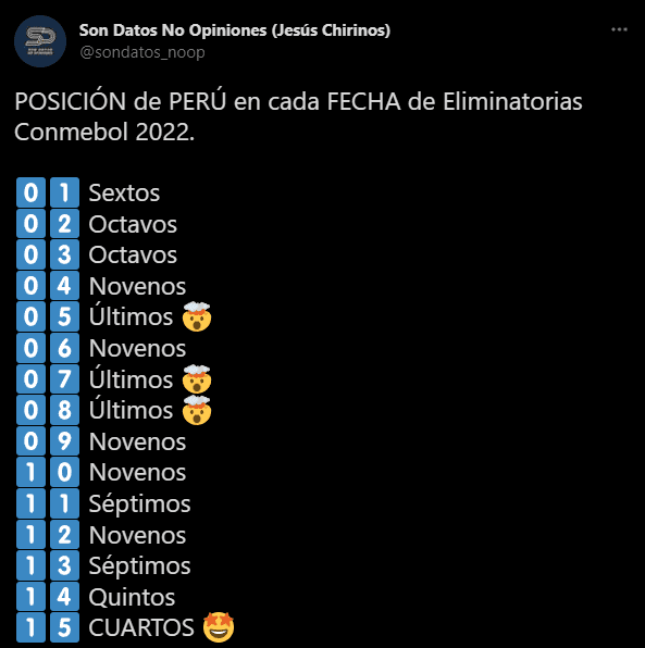 Los amigos de ‘Son Datos No Opiniones’ lanzaron una estadística importante, la cual detalla cómo evolucionó el equipo de Ricardo Gareca: “POSICIÓN de PERÚ en cada FECHA de Eliminatorias Conmebol 2022”. Pasando a colocar fecha tras fecha, en qué puesto estaba nuestro combinado patrio, y cómo evolucionó hasta la jornada 15 donde nos encontramos.