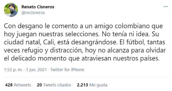 “Con desgano le comento a un amigo colombiano que hoy juegan nuestras selecciones. No tenía ni idea. Su ciudad natal, Cali, está desangrándose. El fútbol, tantas veces refugio y distracción, hoy no alcanza para olvidar el delicado momento que atraviesan nuestros países”, escribió Cisneros. Así, se manifestó el reconocido comunicador.