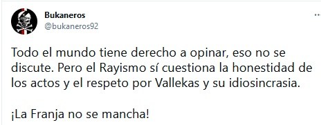 Y es que Bukaneros, una comunidad de hinchas del Rayo Vallecano, club vínculado a la clase obrera española, repudió el accionar del peruano. Sacaron un comunicado diciendo “la franja no se mancha”.