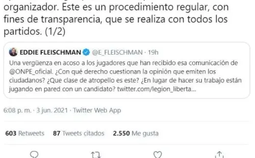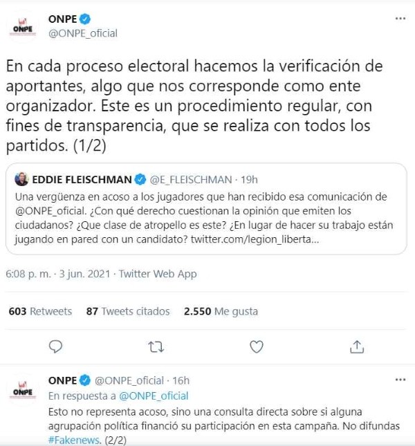 Entonces, en twitter, la ONPE respondió: “En cada proceso electoral hacemos la verificación de aportantes, algo que nos corresponde como ente organizador. Este es un procedimiento regular, con fines de transparencia, que se realiza con todos los partidos”.