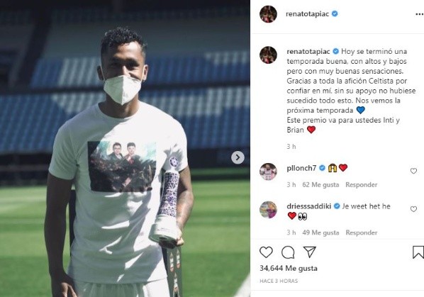 El volante de la selección peruana vistió un polo en homenaje a los dos jóvenes, además de publicar en su cuenta de Instagram: “Gracias a toda la afición Celtista por confiar en mí, sin su apoyo no hubiese sucedido todo esto. Nos vemos la próxima temporada. Este premio va para ustedes Inti y Brian”.