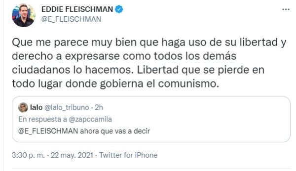 El periodista escribió: “Me parece muy bien que haga uso de su libertad y derecho a expresarse como todos los demás ciudadanos lo hacemos. Libertad que se pierde en todo lugar donde gobierna el comunismo”.