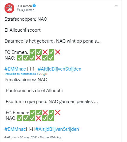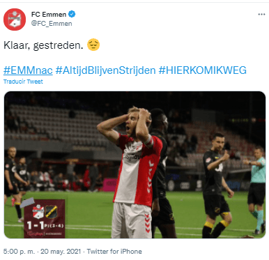 La ronda final de penales dejó como ganador a NAC Breda por (3-4). Con este resultado, y tras el empate (1-1) en el tiempo reglamentario, el equipo de los peruanos, descendió a la segunda división, al perder en los play-offs. FC Emmen terminó la temporada en el puesto 19 con 30 puntos. Una lástima por nuestros compatriotas, pero el fútbol es así.