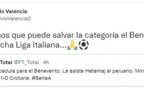En su cuenta principal de Twitter, Valencia propuso un mensaje de apoyo para el futbolista hoy en consideración especial de Ricardo Gareca: “Esperemos que puede salvar la categoría el Benevento, falta 1 fecha en la Liga italiana”. Generando algunos respaldos por parte de sus seguidores.