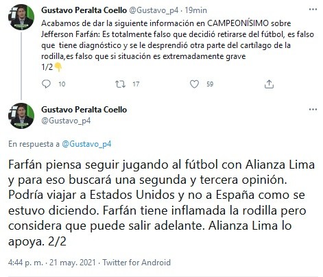 “Farfán piensa seguir jugando al fútbol con Alianza Lima y para eso buscará una segunda y tercera opinión. Podría viajar a Estados Unidos y no a España como se estuvo diciendo. Farfán tiene inflamada la rodilla pero considera que puede salir adelante. Alianza Lima lo apoya”, complementó luego.
