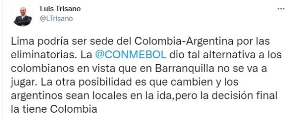 “Lima podría ser sede del Colombia-Argentina por las eliminatorias. La dio tal alternativa a los colombianos en vista que en Barranquilla no se va a jugar. La otra posibilidad es que cambien y los argentinos sean locales en la ida,pero la decisión final la tiene Colombia”, indicó el periodista Lucho Trisano.