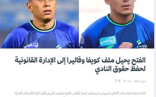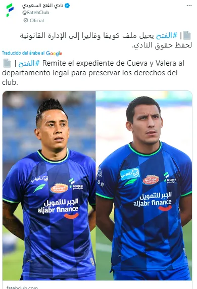 “La administración de Al-Fateh remitió el expediente de la dupla peruana Christian Cueva y Alex Valera, profesionales del primer equipo de fútbol, a la asesoría jurídica del club, luego de que afirmaron que sus contratos con el club habían sido rescindidos por el retraso en sus pagos financieros.