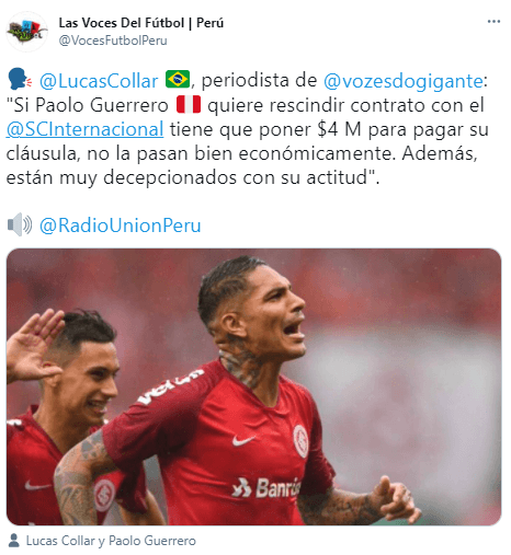 Además, también se confirmó el mal comportamiento del delantero peruano para con la institución gaucha: “Si Paolo Guerrero quiere rescindir contrato con el ‘SC Internacional’ tiene que poner $4 M para pagar su cláusula, no la pasan bien económicamente. Además, están muy decepcionados con su actitud”.