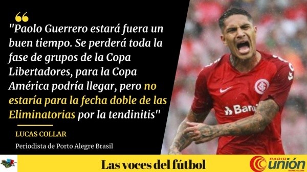 En conversación con ‘Las Voces del Fútbol’, el periodista brasileño Lucas Collar, sostuvo la complicación física que hoy tiene ‘El Depredador’: “Paolo Guerrero Bandera de Perú estará fuera un buen tiempo. Se perderá toda la Fase de Grupos de la Copa Libertadores, para la Copa América podría llegar, pero no estaría para la fecha doble de Eliminatorias por Tendinitis”. Esta información se hizo extensa aquí en Bolavip hace unos días.