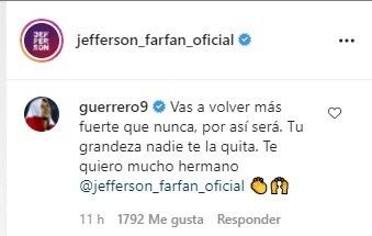 “Vas a volver más fuerte que nunca, por así será. Tu grandeza nadie te la quita. Te quiero mucho hermano @jefferson_farfan_oficial ����”. Fue la emotiva dedicatoria hecha por Paolo Guerrero, a su compadre Jefferson Farfán. Por ahí también apareció otro de los compañeros en Alianza Lima de ‘La Foquita’.