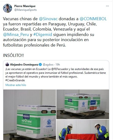 Y es que las otras Selecciones sí pudieron aplicarse la dosis brindada por la CONMEBOL. Entonces, una voz como la de Pierre Manrique comenzó con unas sospechas contra el MINSA y la FPF.
