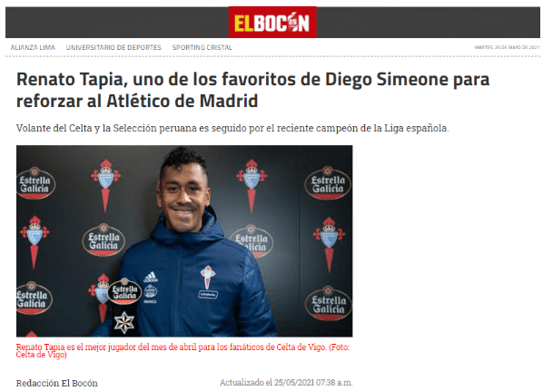 Mientras que ‘El Bocón’ da un paso más adelante con sus siguientes apreciaciones: “Las buenas actuaciones con el Celta, donde fue figura del once de Coudet, llamaron la atención de Simeone. Es más, se conoció que ya le ha venido haciendo seguimiento futbolístico y hasta solicitar algunas referencias al propio Chacho y Gareca”.