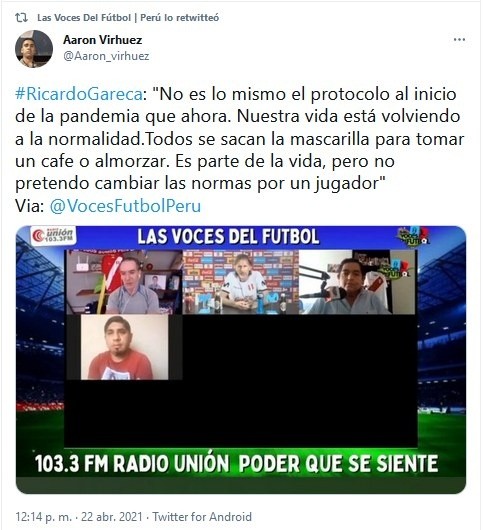 “No es lo mismo el protocolo al inicio de la pandemia que ahora. Nuestra vida está volviendo a la normalidad.Todos se sacan la mascarilla para tomar un cafe o almorzar. Es parte de la vida, pero no pretendo cambiar las normas por un jugador”, señaló el Tigre en Voces del Fútbol.